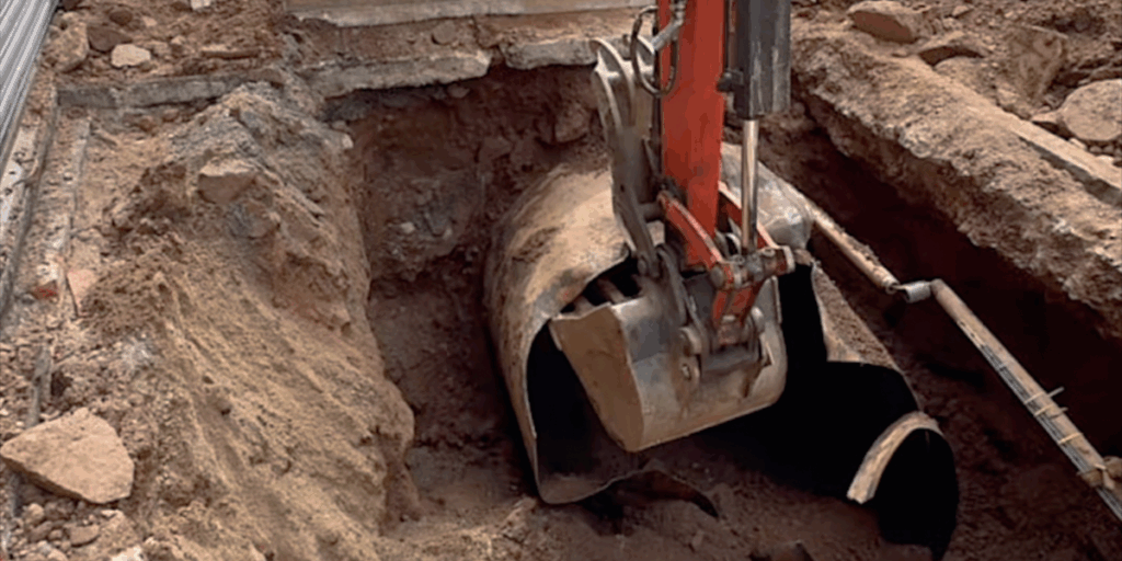 A police officer was required on-site during the project to safely close the sidewalk and protect pedestrians. Once the concrete was jackhammered and removed, we excavated and removed the tank. Upon inspection, it was clear that the tank had failed, containing dozens—if not hundreds—of holes.